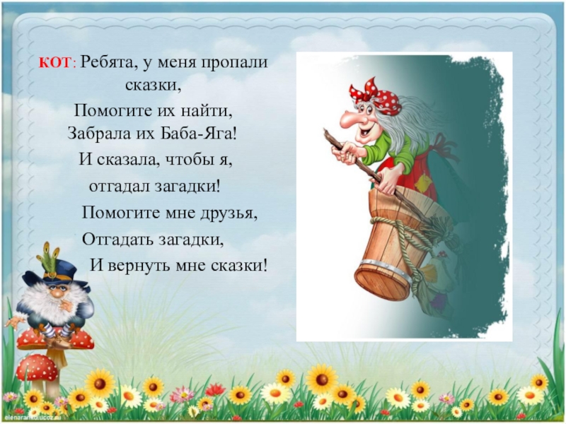 Слайд 5КОТ: Ребята, у меня пропали сказки,
