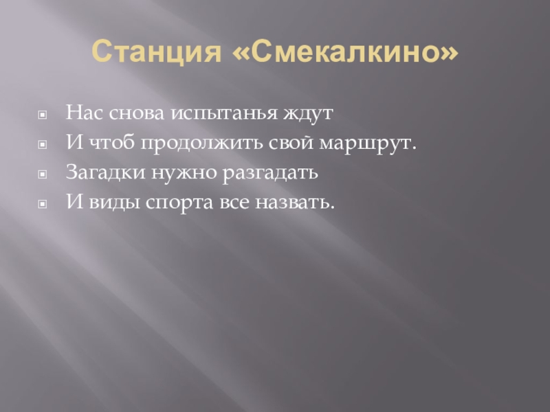 Станция «Смекалкино» Нас снова испытанья ждутИ чтоб продолжить свой маршрут.Загадки нужно разгадатьИ виды спорта все назвать.