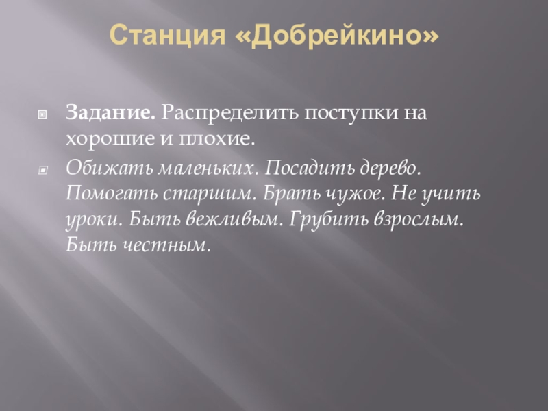 Станция «Добрейкино» Задание. Распределить поступки на хорошие и плохие. Обижать маленьких. Посадить дерево. Помогать старшим. Брать чужое.