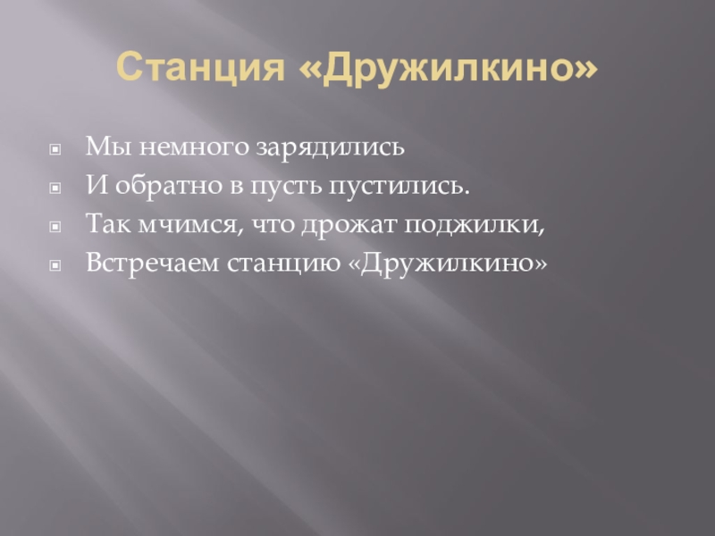 Станция «Дружилкино»Мы немного зарядилисьИ обратно в пусть пустились.Так мчимся, что дрожат поджилки,Встречаем станцию «Дружилкино»