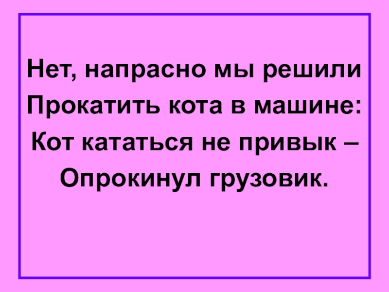 Нет, напрасно мы решилиПрокатить кота в машине:Кот кататься не привык – Опрокинул грузовик.