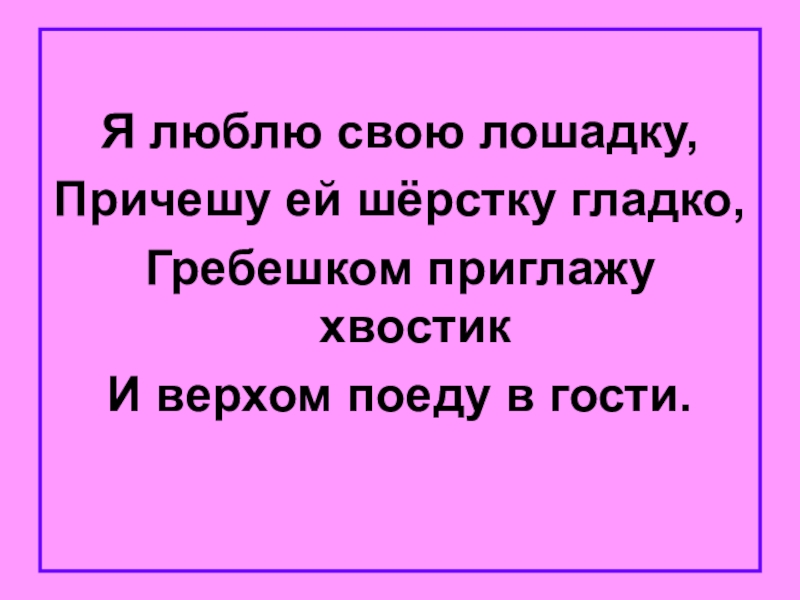Я люблю свою лошадку,Причешу ей шёрстку гладко,Гребешком приглажу хвостикИ верхом поеду в гости.
