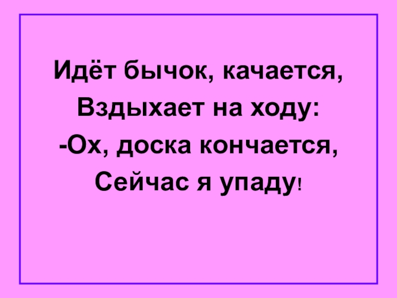 Идёт бычок, качается,Вздыхает на ходу:-Ох, доска кончается,Сейчас я упаду!