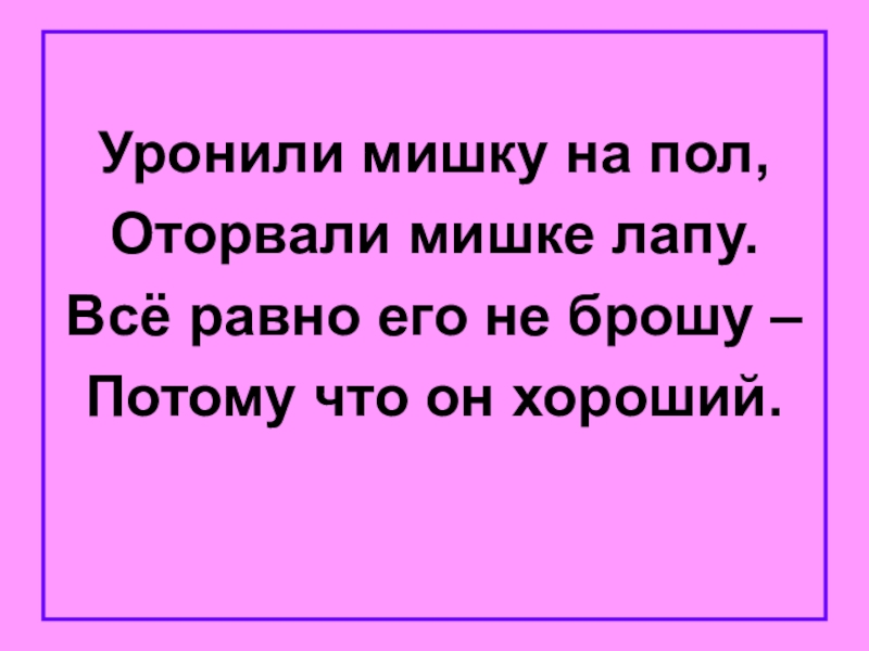 Уронили мишку на пол,Оторвали мишке лапу.Всё равно его не брошу – Потому что он хороший.
