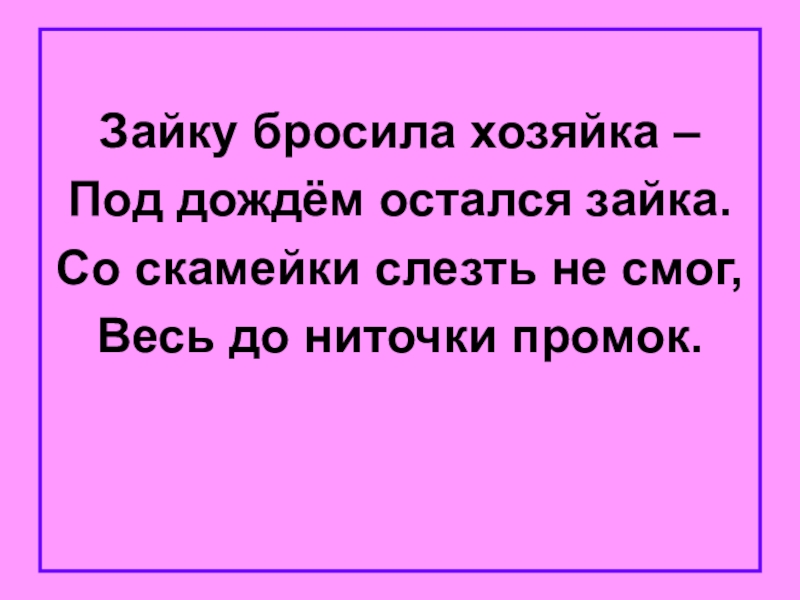 Зайку бросила хозяйка – Под дождём остался зайка.Со скамейки слезть не смог,Весь до ниточки промок.