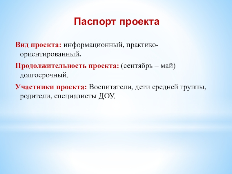Продолжительность проекта: (сентябрь – май) долгосрочный.