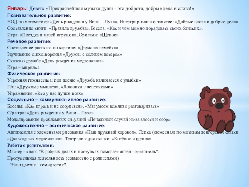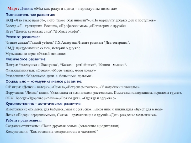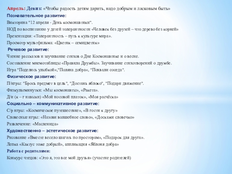 Слайд 14Апрель: Девиз: «Чтобы радость детям дарить, надо добрым и ласковым быть»