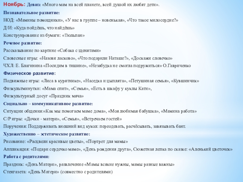 Слайд 9Ноябрь: Девиз: «Много мам на всей планете, всей душой их любят