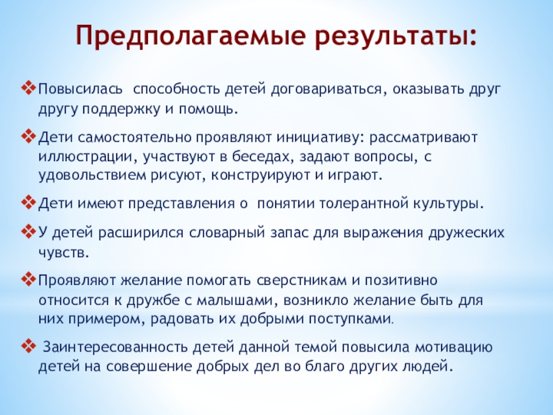 Повысилась способность детей договариваться, оказывать друг другу поддержку и помощь.