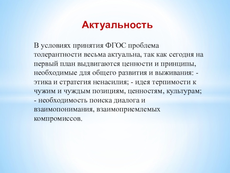 В условиях принятия ФГОС проблема толерантности весьма актуальна, так как сегодня