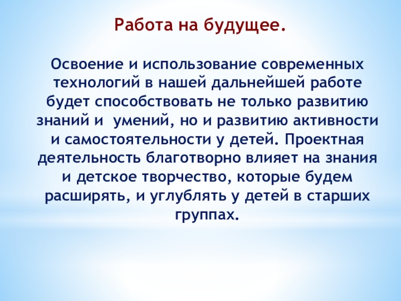 будет способствовать не только развитию знаний и умений, но и развитию активности и самостоятельности у детей. Проектная деятельность благотворно влияет на знания и детское творчество, которые будем расширять, и углублять у детей в старших группах.
