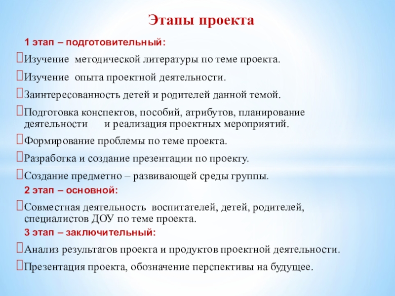 Совместная деятельность воспитателей, детей, родителей, специалистов ДОУ по теме проекта.