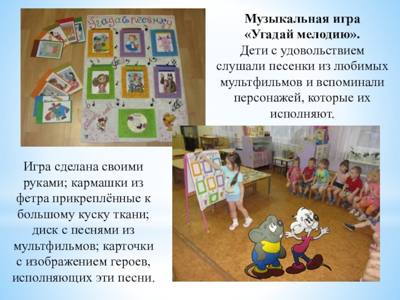 Игра сделана своими руками; кармашки из фетра прикреплённые к большому куску ткани; диск с песнями из мультфильмов; карточки с изображением героев, исполняющих эти песни.