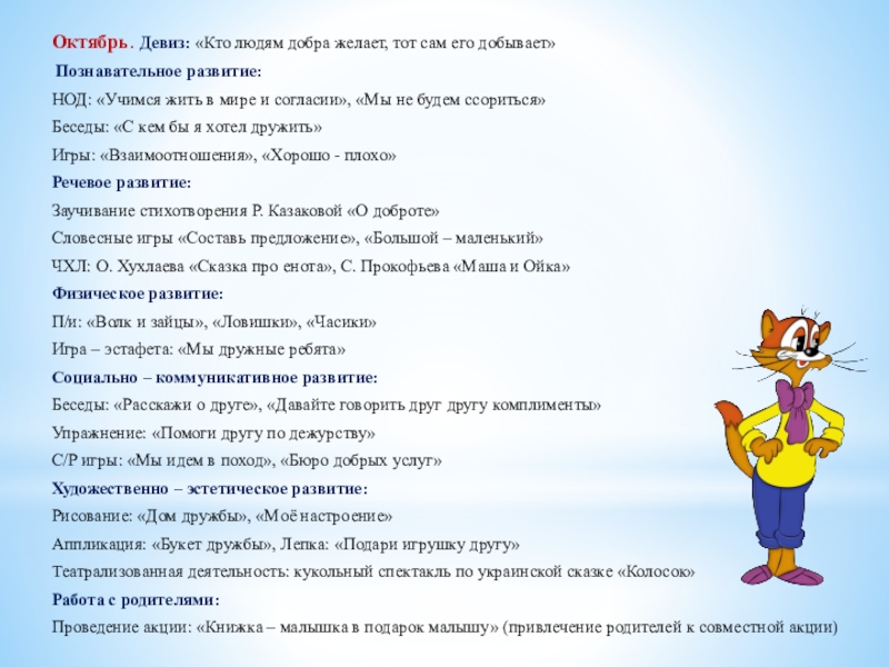 Слайд 8Октябрь. Девиз: «Кто людям добра желает, тот сам его добывает»
