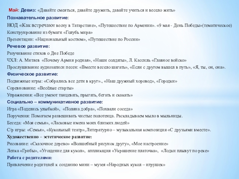Слайд 15 Май: Девиз: «Давайте смеяться, давайте дружить, давайте учиться и весело