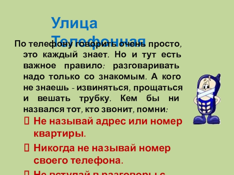 По телефону говорить очень просто, это каждый знает. Но и тут есть важное правило: разговаривать надо только со знакомым. А кого не знаешь - извиняться, прощаться и вешать трубку. Кем бы ни назвался тот, кто звонит, помни: