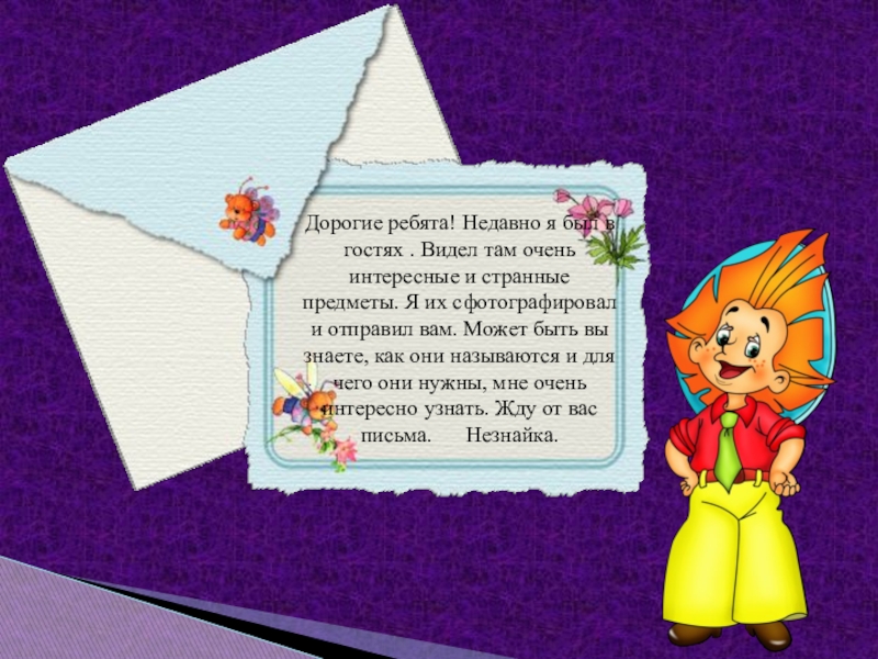 интересные и странные предметы. Я их сфотографировал и отправил вам. Может быть вы знаете, как они называются и для чего они нужны, мне очень интересно узнать. Жду от вас письма. Незнайка.