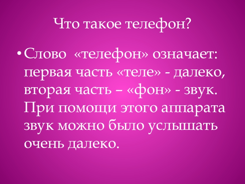 Что такое телефон?Слово «телефон» означает: первая часть «теле» - далеко, вторая часть – «фон» - звук. При помощи этого аппарата звук можно было услышать очень далеко.