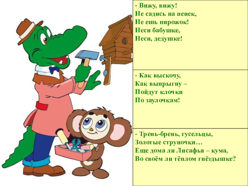 Отгадать, кому из сказочных героев принадлежат слова, как называется сказка.