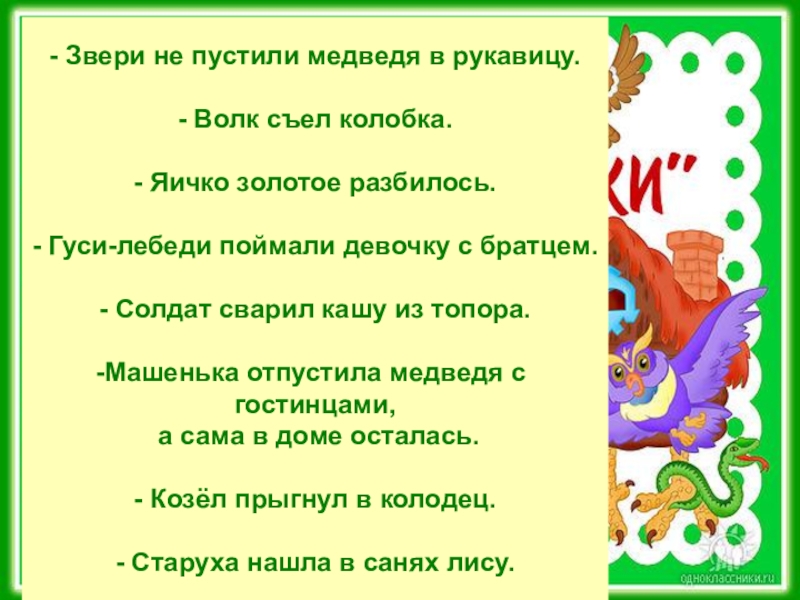 - Звери не пустили медведя в рукавицу.- Волк съел колобка.- Яичко золотое разбилось.- Гуси-лебеди поймали девочку с