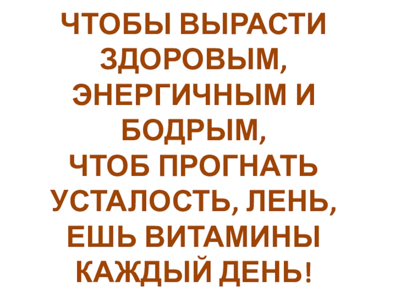 ЧТОБЫ ВЫРАСТИ ЗДОРОВЫМ,ЭНЕРГИЧНЫМ И БОДРЫМ, ЧТОБ ПРОГНАТЬ УСТАЛОСТЬ, ЛЕНЬ,ЕШЬ ВИТАМИНЫ КАЖДЫЙ ДЕНЬ!