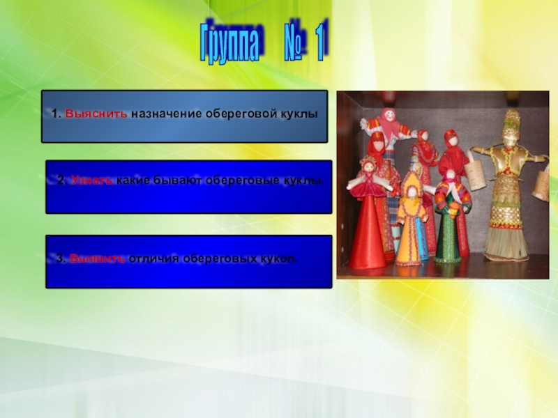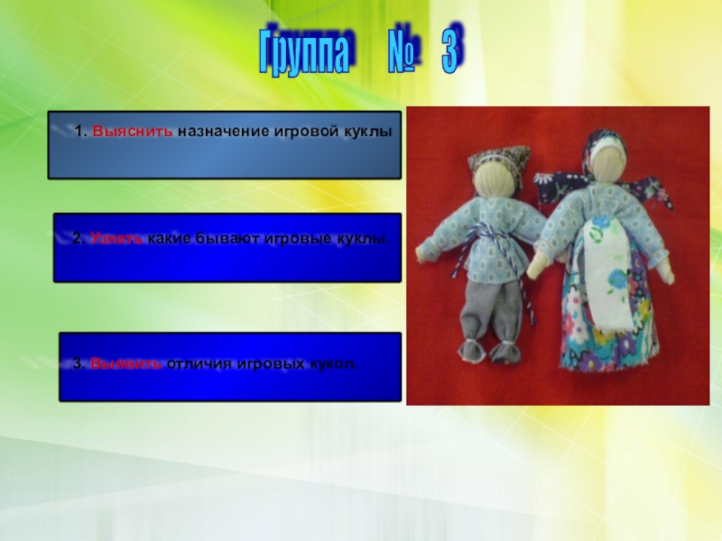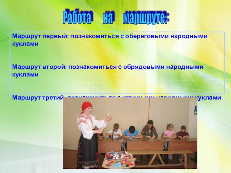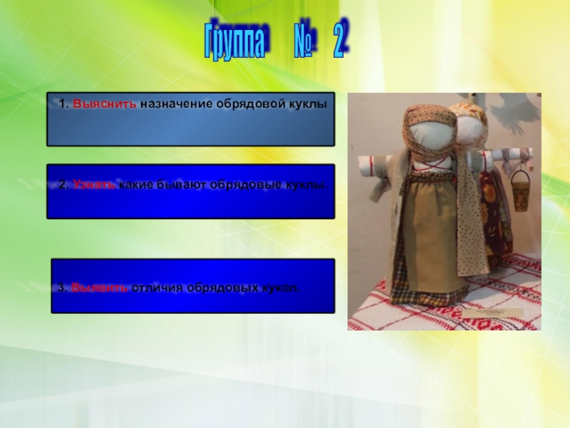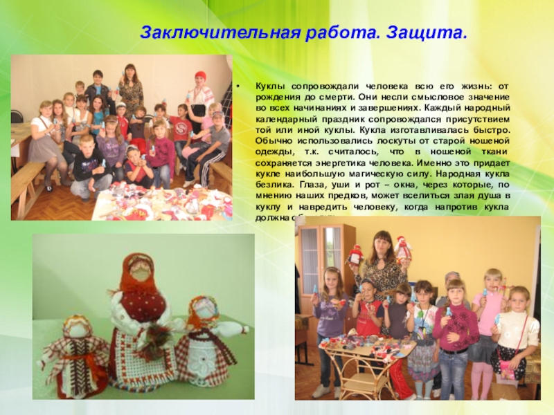Куклы сопровождали человека всю его жизнь: от рождения до смерти. Они несли смысловое значение во всех начинаниях и завершениях. Каждый народный календарный праздник сопровождался присутствием той или иной куклы. Кукла изготавливалась быстро. Обычно использовались лоскуты от старой ношеной одежды, т.к. считалось, что в ношеной ткани сохраняется энергетика человека. Именно это придает кукле наибольшую магическую силу. Народная кукла безлика. Глаза, уши и рот – окна, через которые, по мнению наших предков, может вселиться злая душа в куклу и навредить человеку, когда напротив кукла должна оберегать.