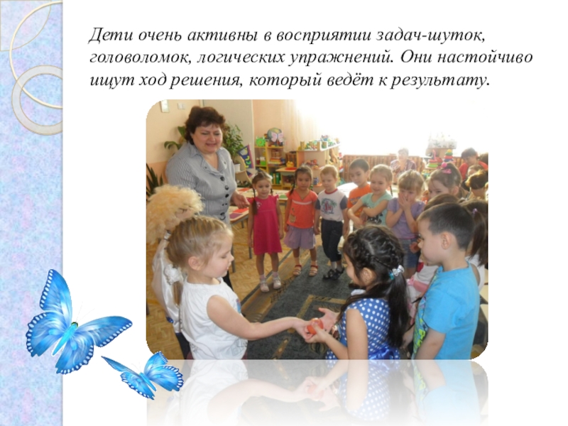 Слайд 7Дети очень активны в восприятии задач-шуток, головоломок, логических упражнений. Они настойчиво