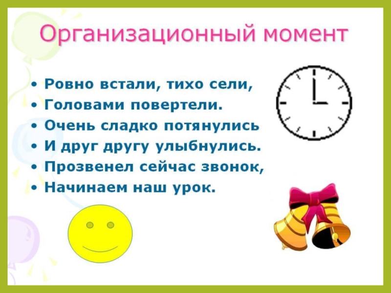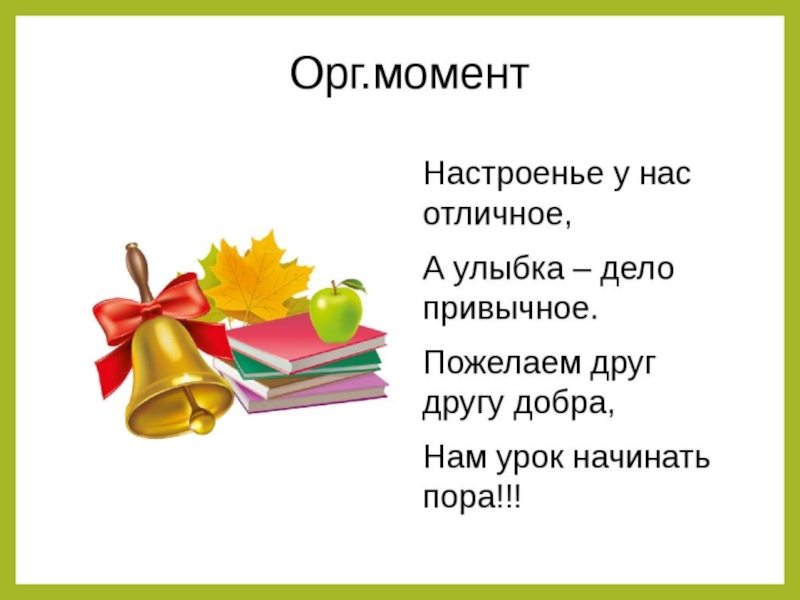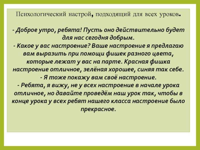 - Ребята, я вижу, не у всех настроение в начале урока отличное, но давайте проведём наш урок так, чтобы в конце урока у всех ребят нашего класса настроение было прекрасное.