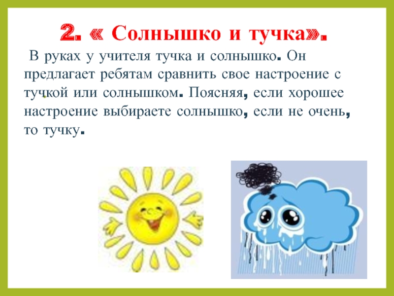 предлагает ребятам сравнить свое настроение с тучкой или солнышком. Поясняя, если хорошее настроение выбираете солнышко, если не очень, то тучку.