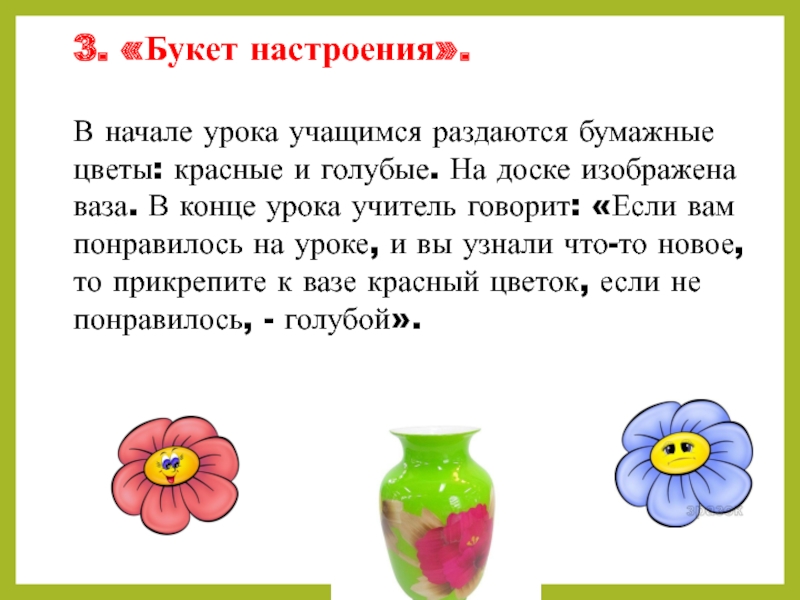 голубые. На доске изображена ваза. В конце урока учитель говорит: «Если вам понравилось на уроке, и вы узнали что-то новое, то прикрепите к вазе красный цветок, если не понравилось, - голубой».
