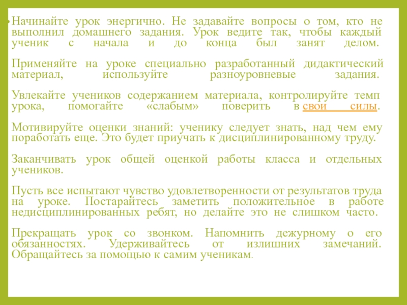 Слайд 8Начинайте урок энергично. Не задавайте вопросы о том, кто не выполнил