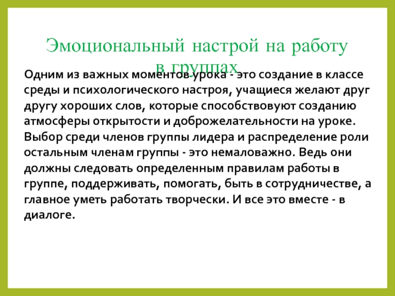 это создание в классе среды и психологического настроя, учащиеся желают друг другу хороших слов, которые способствовуют созданию атмосферы открытости и доброжелательности на уроке. Выбор среди членов группы лидера и распределение роли остальным членам группы - это немаловажно. Ведь они должны следовать определенным правилам работы в группе, поддерживать, помогать, быть в сотрудничестве, а главное уметь работать творчески. И все это вместе - в диалоге.
