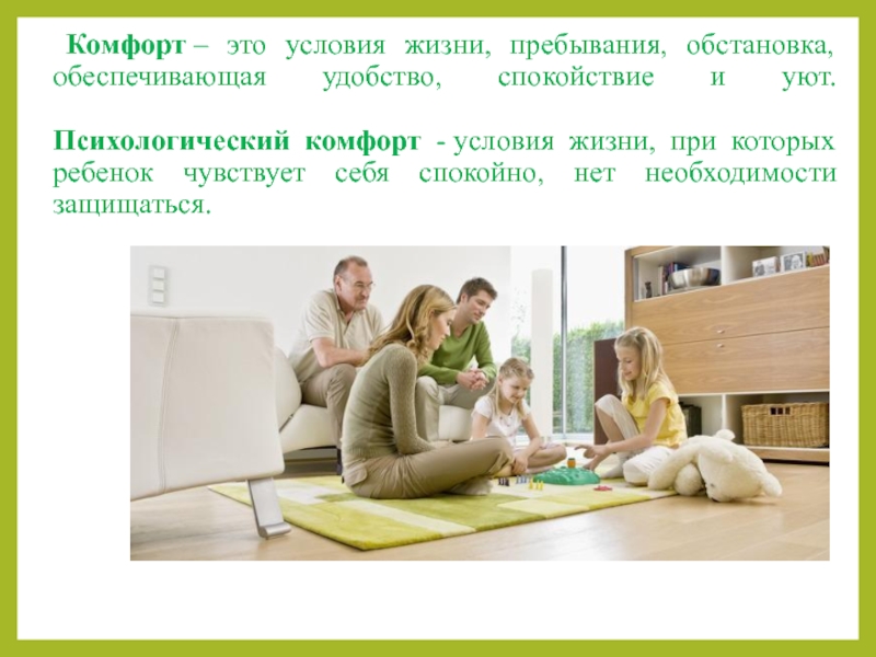 Психологический комфорт - условия жизни, при которых ребенок чувствует себя спокойно, нет необходимости защищаться.