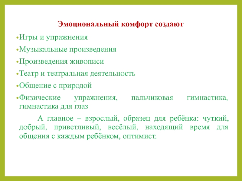А главное – взрослый, образец для ребёнка: чуткий, добрый, приветливый, весёлый, находящий время для общения с каждым ребёнком, оптимист.