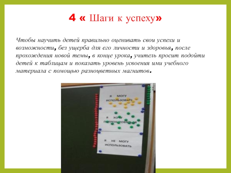 и возможности, без ущерба для его личности и здоровья, после прохождения новой темы, в конце урока, учитель просит подойти детей к таблицам и показать уровень усвоения ими учебного материала с помощью разноцветных магнитов.