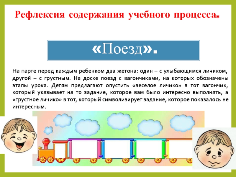 улыбающимся личиком, другой – с грустным. На доске поезд с вагончиками, на которых обозначены этапы урока. Детям предлагают опустить «веселое личико» в тот вагончик, который указывает на то задание, которое вам было интересно выполнять, а «грустное личико» в тот, который символизирует задание, которое показалось не интересным.