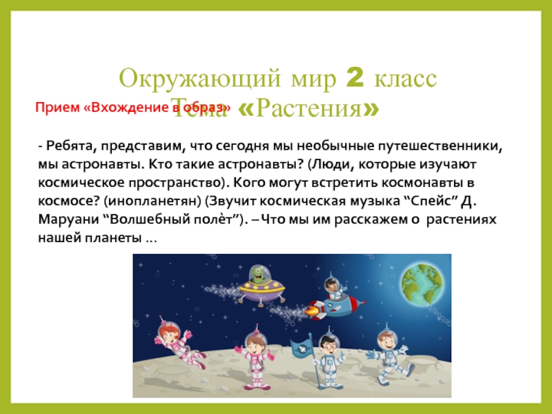 что сегодня мы необычные путешественники, мы астронавты. Кто такие астронавты? (Люди, которые изучают космическое пространство). Кого могут встретить космонавты в космосе? (инопланетян) (Звучит космическая музыка “Спейс” Д. Маруани “Волшебный полѐт”). – Что мы им расскажем о растениях нашей планеты …