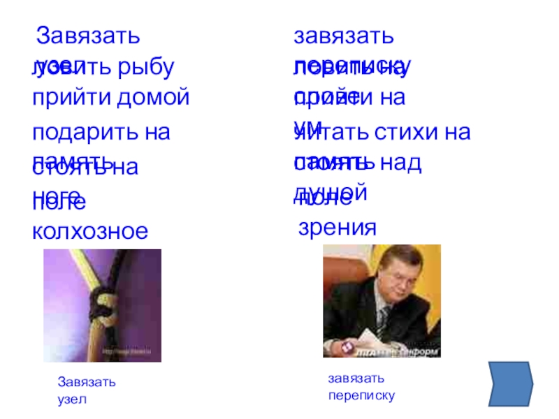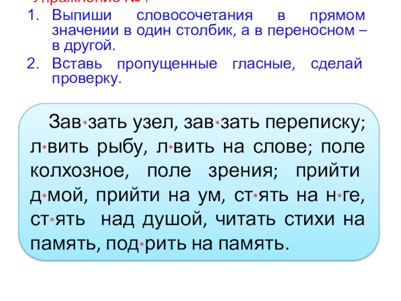 Зав*зать узел, зав*зать переписку; л*вить рыбу, л*вить на слове; поле колхозное, поле зрения; прийти д*мой, прийти на ум, ст*ять на н*ге, ст*ять над душой, читать стихи на память, под*рить на память.