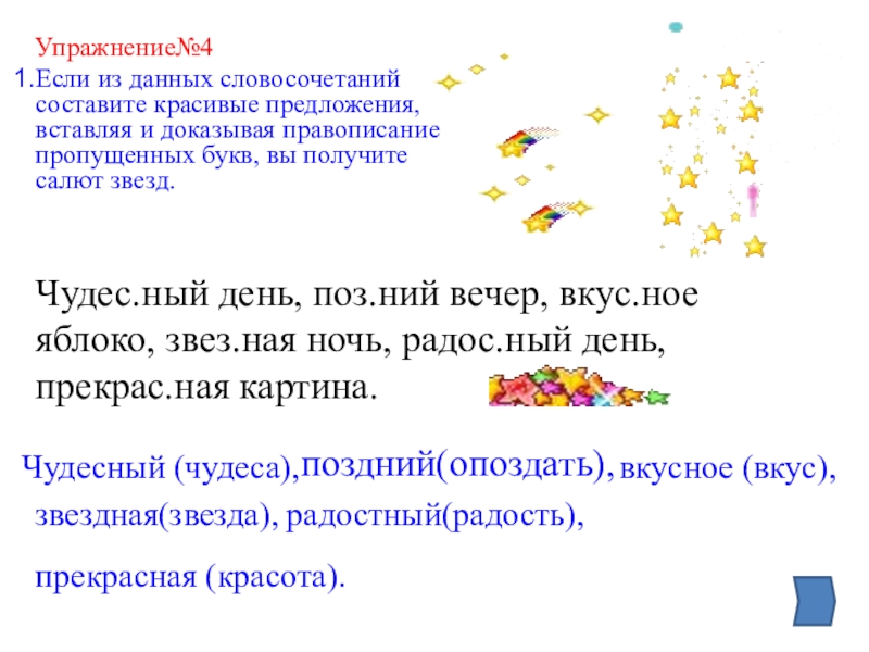 Чудес.ный день, поз.ний вечер, вкус.ное яблоко, звез.ная ночь, радос.ный день, прекрас.ная картина.