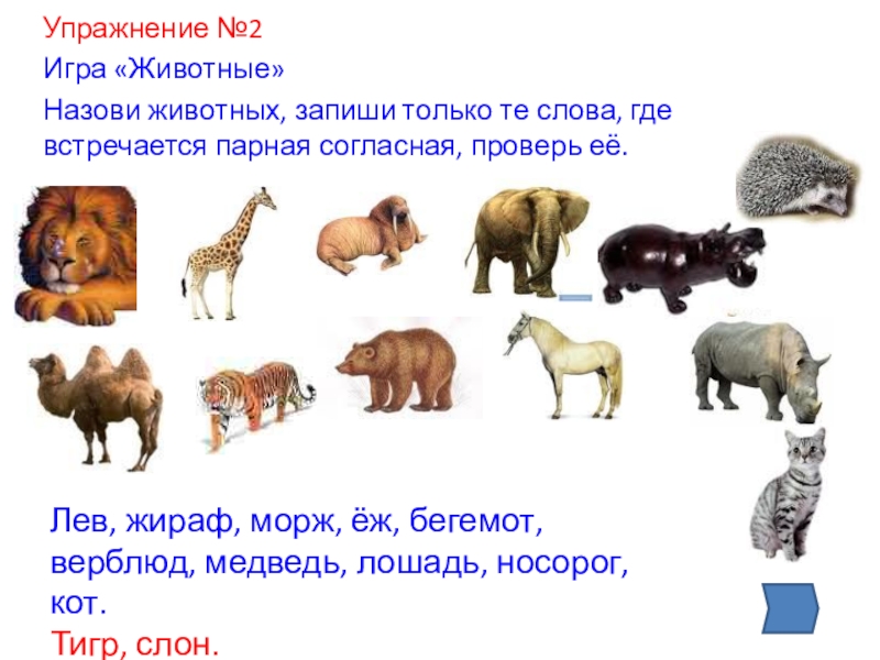 Лев, жираф, морж, ёж, бегемот, верблюд, медведь, лошадь, носорог, кот.