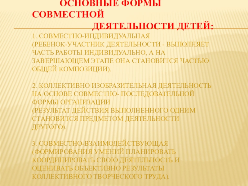 деятельности детей: 1. Совместно-индивидуальная (ребенок-участник деятельности - выполняет часть работы индивидуально, а на завершающем этапе она становится частью общей композиции). 2. Коллективно изобразительная деятельность на основе совместно- последовательной формы организации (результат действия выполненного одним становится предметом деятельности другого). 3. Совместно-взаимодействующая (формирования умений планировать координировать свою деятельность и оценивать объективно результаты коллективного творческого труда).