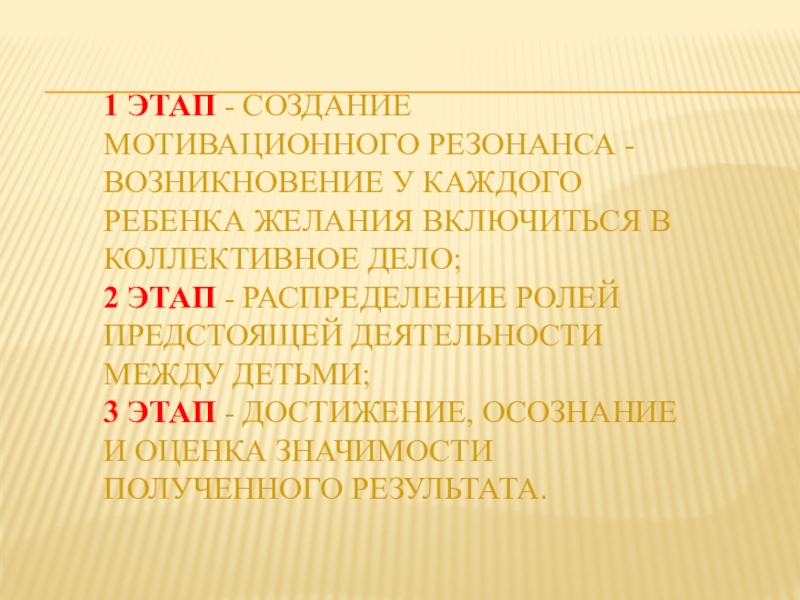 1 этап - создание мотивационного резонанса - возникновение у каждого ребенка желания включиться в коллективное дело; 2