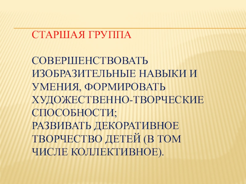 Слайд 10Старшая группа Совершенствовать изобразительные навыки и умения, формировать художественно-творческие способности; развивать декоративное творчество