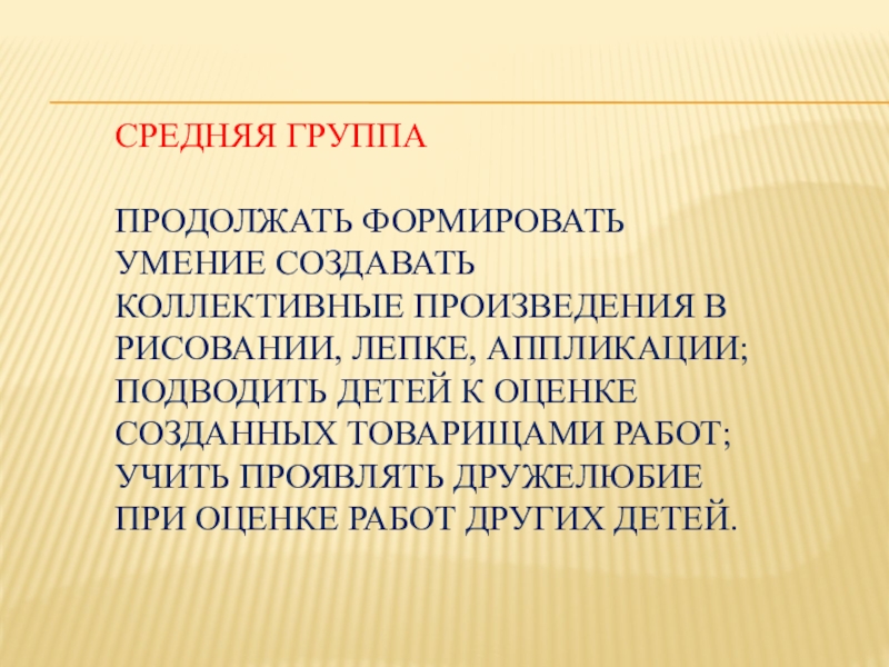 Слайд 9Средняя группа Продолжать формировать умение создавать коллективные произведения в рисовании, лепке, аппликации; подводить