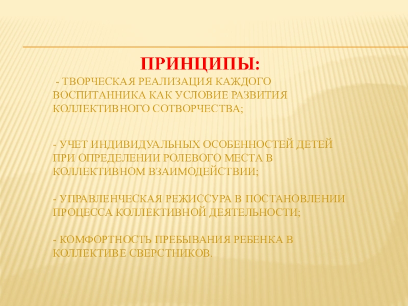 - творческая реализация каждого воспитанника как условие развития коллективного сотворчества; - учет индивидуальных особенностей детей при определении ролевого места в коллективном взаимодействии; - управленческая режиссура в постановлении процесса коллективной деятельности; - комфортность пребывания ребенка в коллективе сверстников.