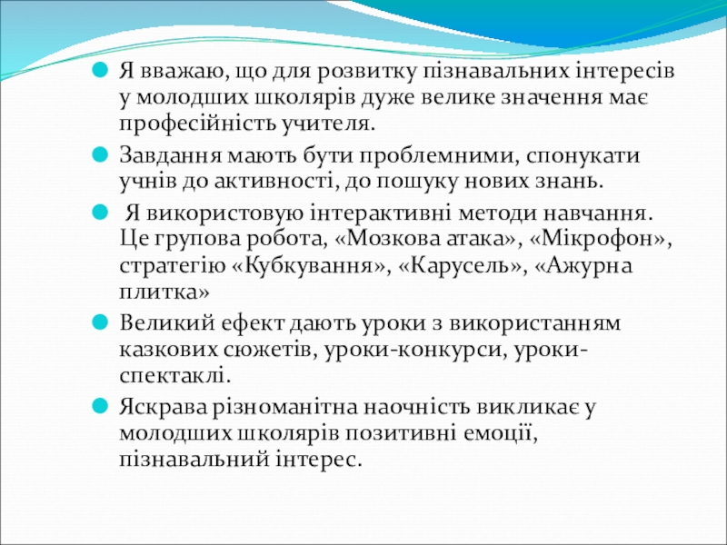 Результати досліджень показують, що основна роль у вихованні пізнавальних інтересів належить способу організації вчителем діяльності.