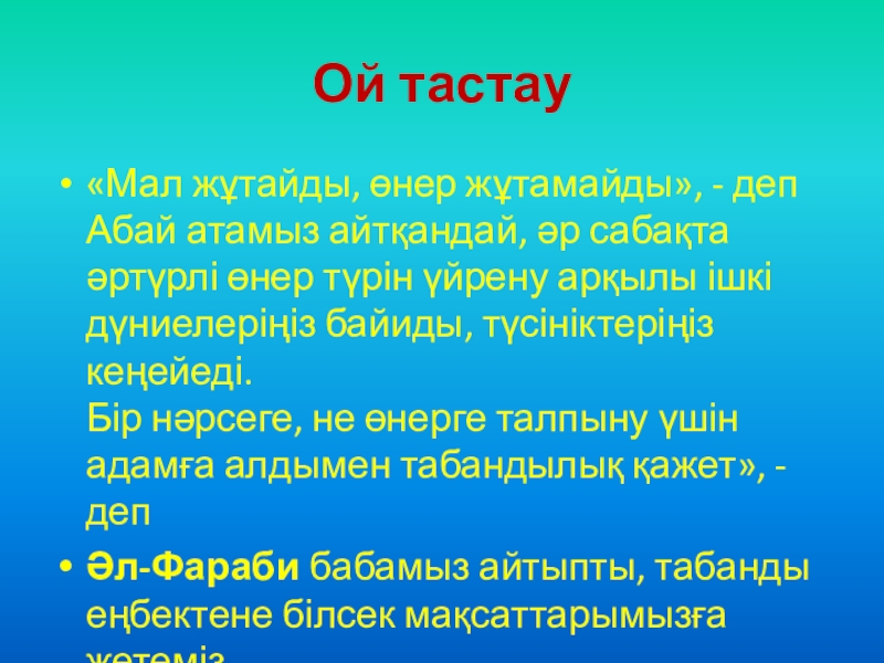 Әл-Фараби бабамыз айтыпты, табанды еңбектене білсек мақсаттарымызға жетеміз.