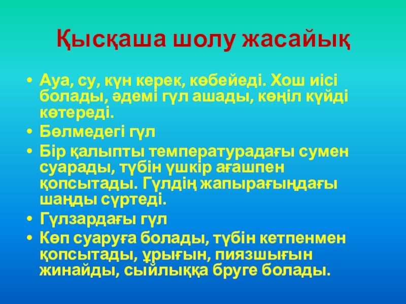 Ауа, су, күн керек, көбейеді. Хош иісі болады, әдемі