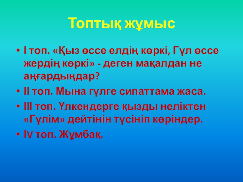 ІІІ топ. Үлкендерге қызды неліктен «Гүлім» дейтінін түсініп көріндер.