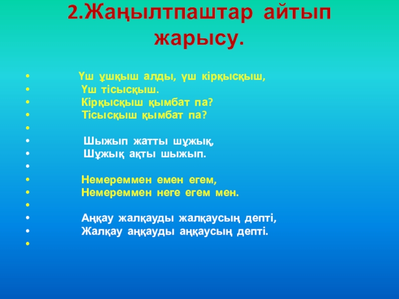 Слайд 122.Жаңылтпаштар айтып жарысу.